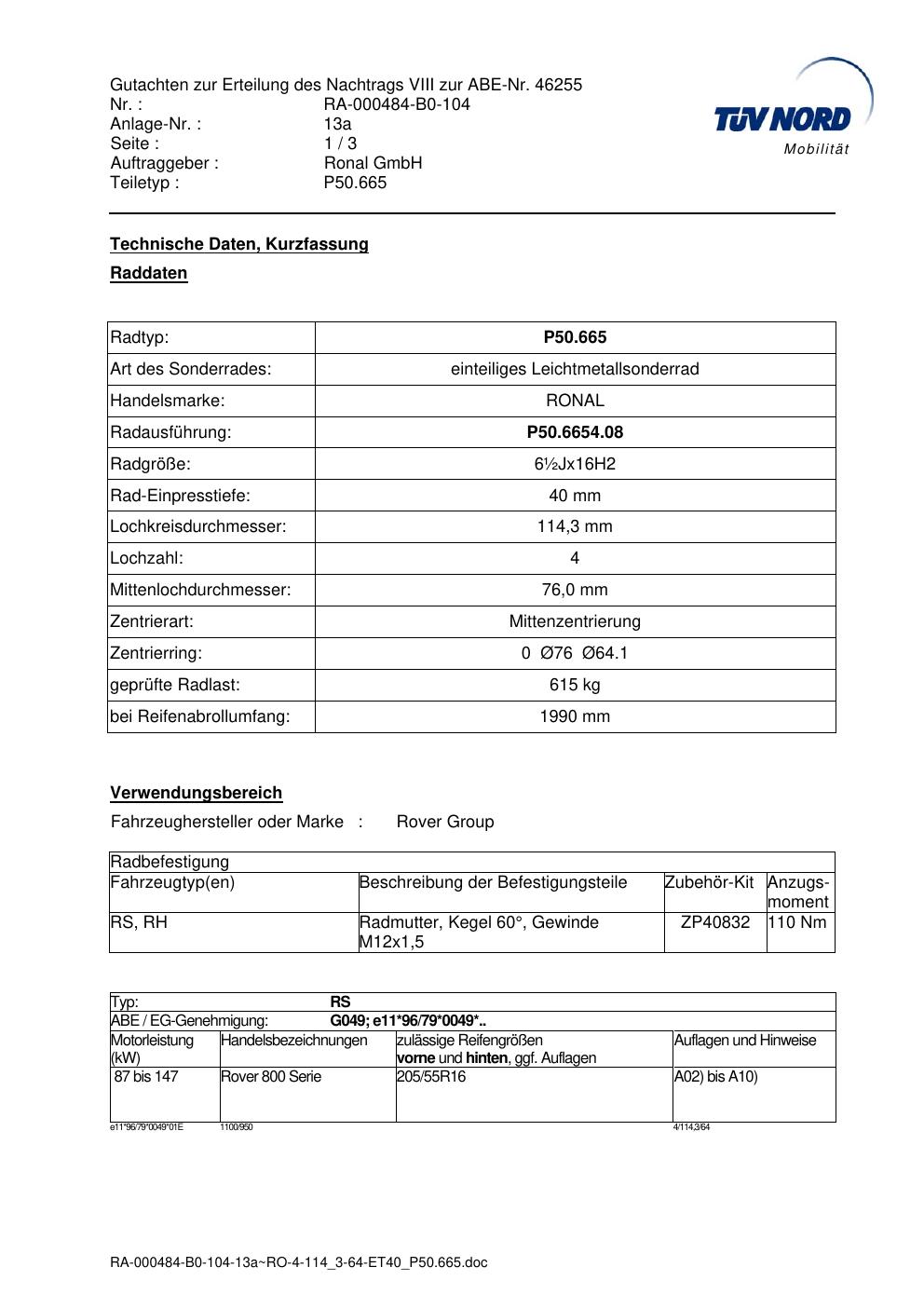 Dieses Gutachten (abe) bezieht sich auf die Alufelge Ronal P50.665 in der Ausführung ET 0, Mittenloch 0 mm (KBA 46255). Im PDF findest du typischerweise zulässige Reifengrößen, Auflagen/Anbauhinweise und – je nach Dokument – Hinweise zur Eintragung.