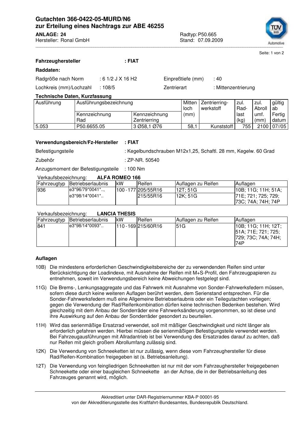 Dieses Gutachten (abe) bezieht sich auf die Alufelge Ronal P50.665 in der Ausführung 2Jx16 ET 0, Mittenloch 0 mm (KBA 46255). Im PDF findest du typischerweise zulässige Reifengrößen, Auflagen/Anbauhinweise und – je nach Dokument – Hinweise zur Eintragung.