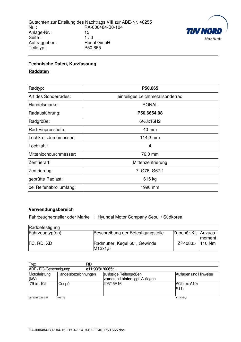 Dieses Gutachten (abe) bezieht sich auf die Alufelge Ronal P50.665 in der Ausführung ET 0, Mittenloch 0 mm (KBA 46255). Im PDF findest du typischerweise zulässige Reifengrößen, Auflagen/Anbauhinweise und – je nach Dokument – Hinweise zur Eintragung.