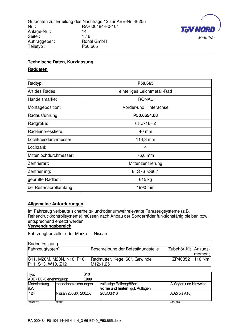 Dieses Gutachten (abe) bezieht sich auf die Alufelge Ronal P50.665 in der Ausführung ET 0, Mittenloch 0 mm (KBA 46255). Im PDF findest du typischerweise zulässige Reifengrößen, Auflagen/Anbauhinweise und – je nach Dokument – Hinweise zur Eintragung.