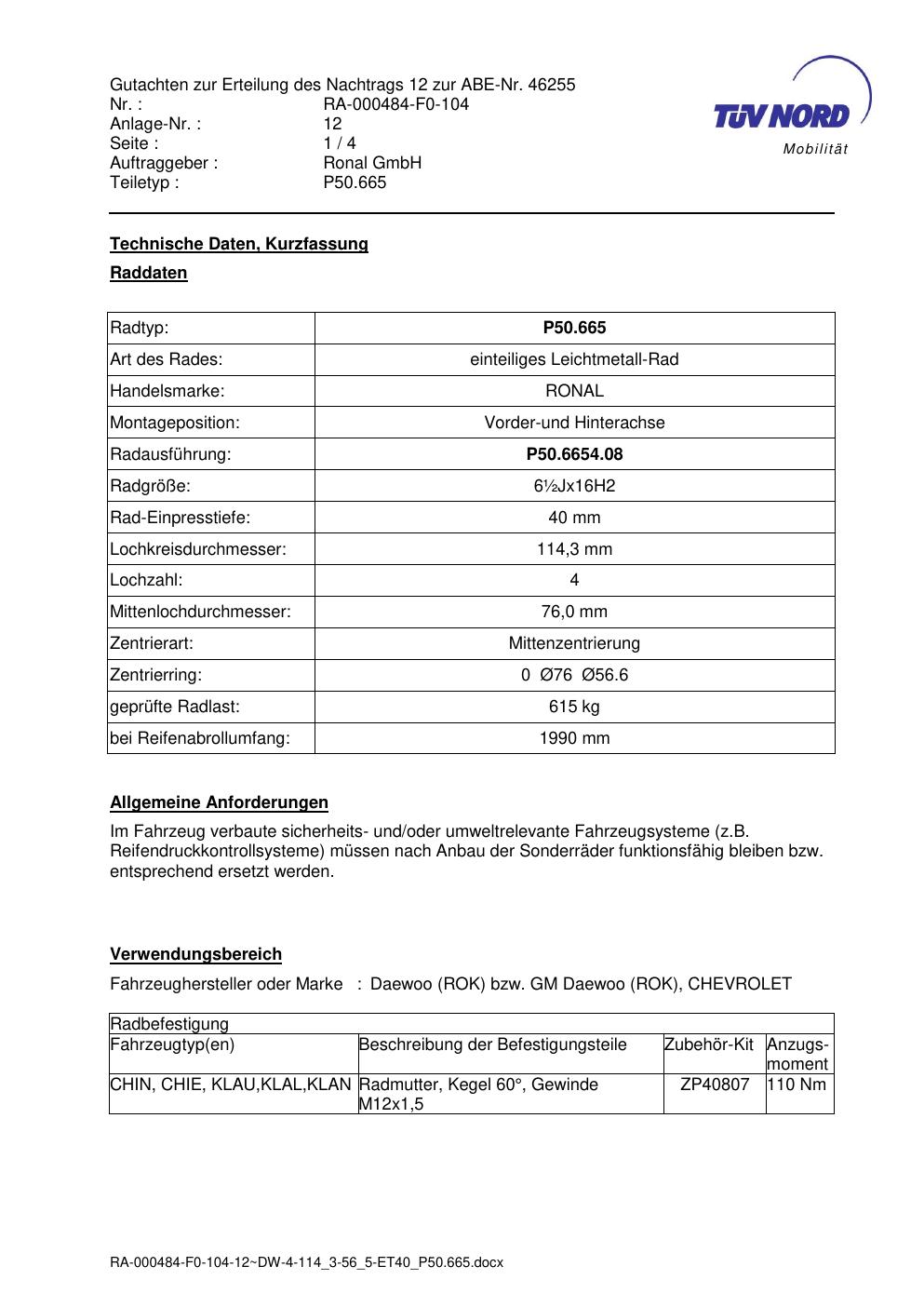 Dieses Gutachten (abe) bezieht sich auf die Alufelge Ronal P50.665 in der Ausführung ET 0, Mittenloch 0 mm (KBA 46255). Im PDF findest du typischerweise zulässige Reifengrößen, Auflagen/Anbauhinweise und – je nach Dokument – Hinweise zur Eintragung.
