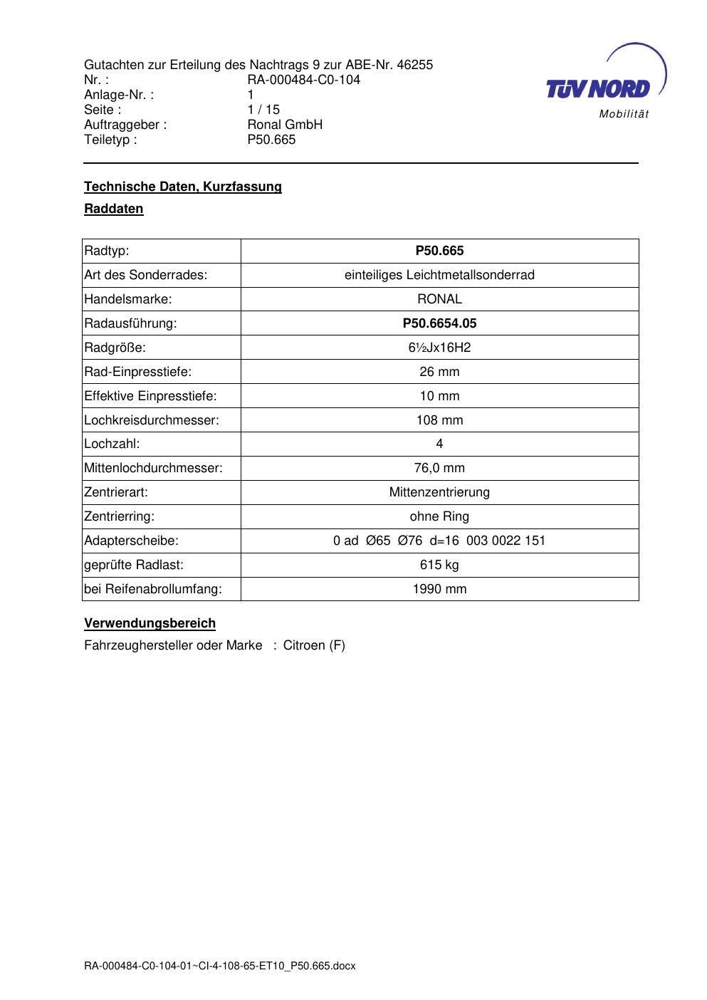 Dieses Gutachten (abe) bezieht sich auf die Alufelge Ronal P50.665 in der Ausführung ET 0, Mittenloch 0 mm (KBA 46255). Im PDF findest du typischerweise zulässige Reifengrößen, Auflagen/Anbauhinweise und – je nach Dokument – Hinweise zur Eintragung.