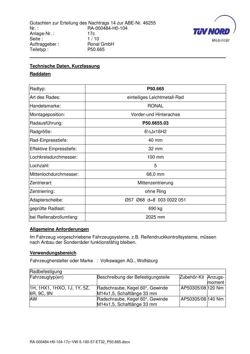 Dieses Gutachten (abe) bezieht sich auf die Alufelge Ronal P50.665 in der Ausführung ET 0, Mittenloch 0 mm (KBA 46255). Im PDF findest du typischerweise zulässige Reifengrößen, Auflagen/Anbauhinweise und – je nach Dokument – Hinweise zur Eintragung.