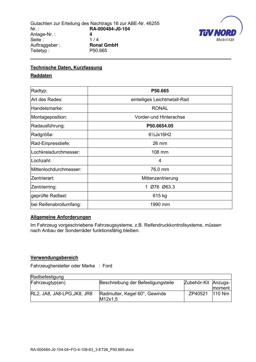 Dieses Gutachten (abe) bezieht sich auf die Alufelge Ronal P50.665 in der Ausführung ET 0, Mittenloch 0 mm (KBA 46255). Im PDF findest du typischerweise zulässige Reifengrößen, Auflagen/Anbauhinweise und – je nach Dokument – Hinweise zur Eintragung.