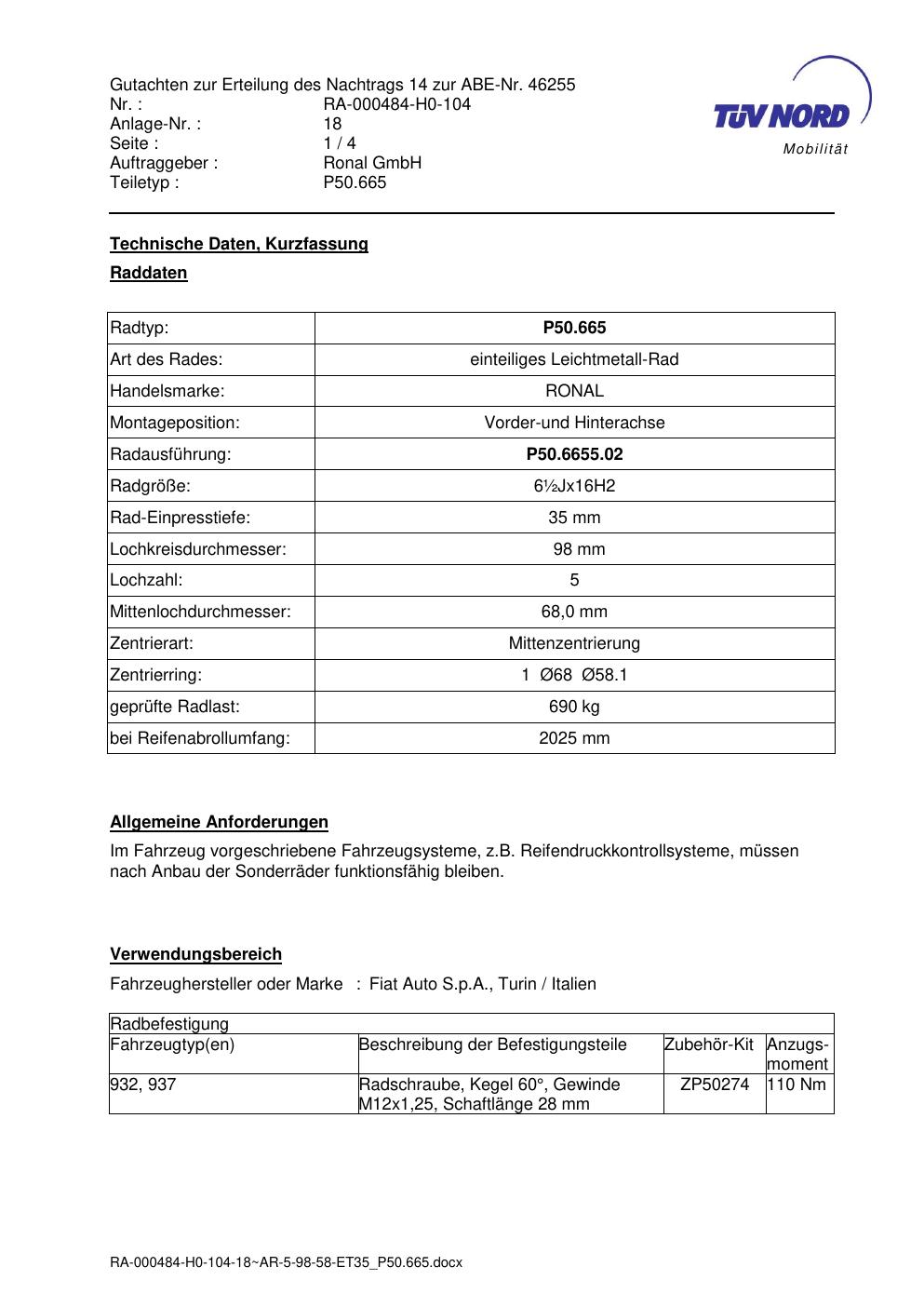 Dieses Gutachten (abe) bezieht sich auf die Alufelge Ronal P50.665 in der Ausführung ET 0, Mittenloch 0 mm (KBA 46255). Im PDF findest du typischerweise zulässige Reifengrößen, Auflagen/Anbauhinweise und – je nach Dokument – Hinweise zur Eintragung.