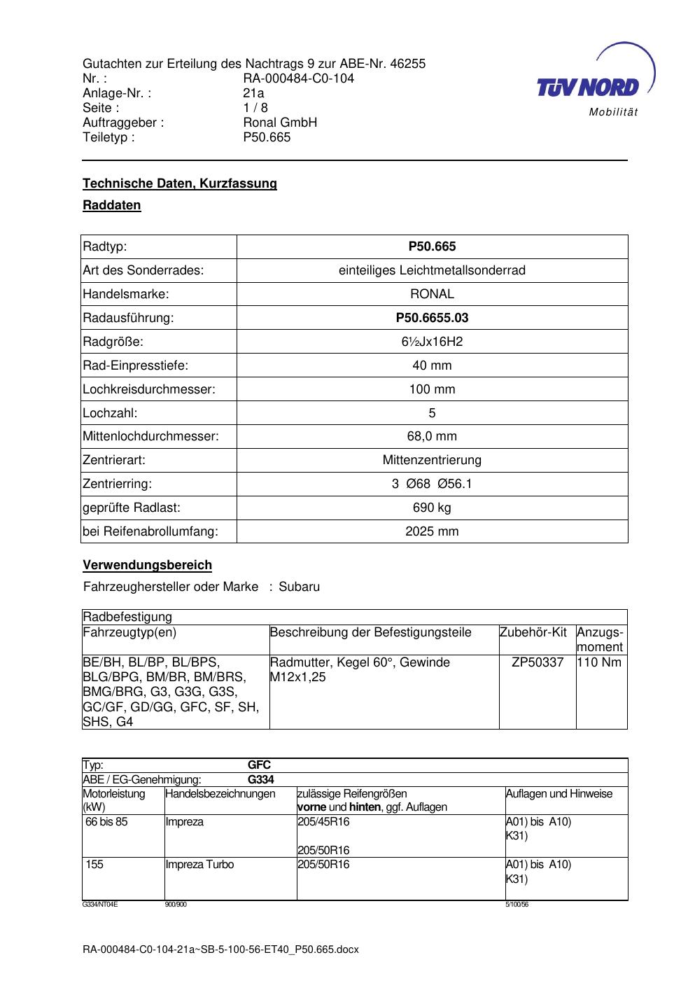 Dieses Gutachten (abe) bezieht sich auf die Alufelge Ronal P50.665 in der Ausführung ET 0, Mittenloch 0 mm (KBA 46255). Im PDF findest du typischerweise zulässige Reifengrößen, Auflagen/Anbauhinweise und – je nach Dokument – Hinweise zur Eintragung.