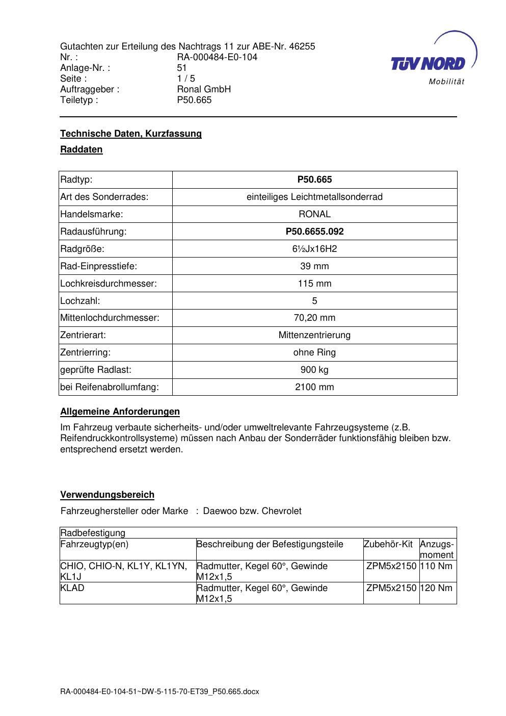 Dieses Gutachten (abe) bezieht sich auf die Alufelge Ronal P50.665 in der Ausführung ET 0, Mittenloch 0 mm (KBA 46255). Im PDF findest du typischerweise zulässige Reifengrößen, Auflagen/Anbauhinweise und – je nach Dokument – Hinweise zur Eintragung.