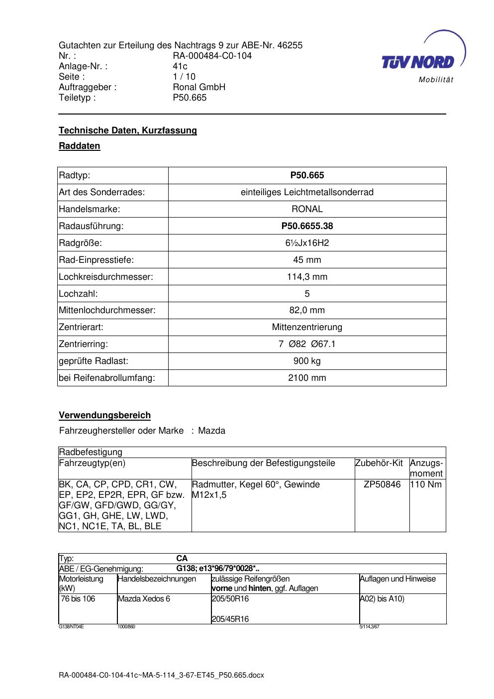 Dieses Gutachten (abe) bezieht sich auf die Alufelge Ronal P50.665 in der Ausführung ET 0, Mittenloch 0 mm (KBA 46255). Im PDF findest du typischerweise zulässige Reifengrößen, Auflagen/Anbauhinweise und – je nach Dokument – Hinweise zur Eintragung.