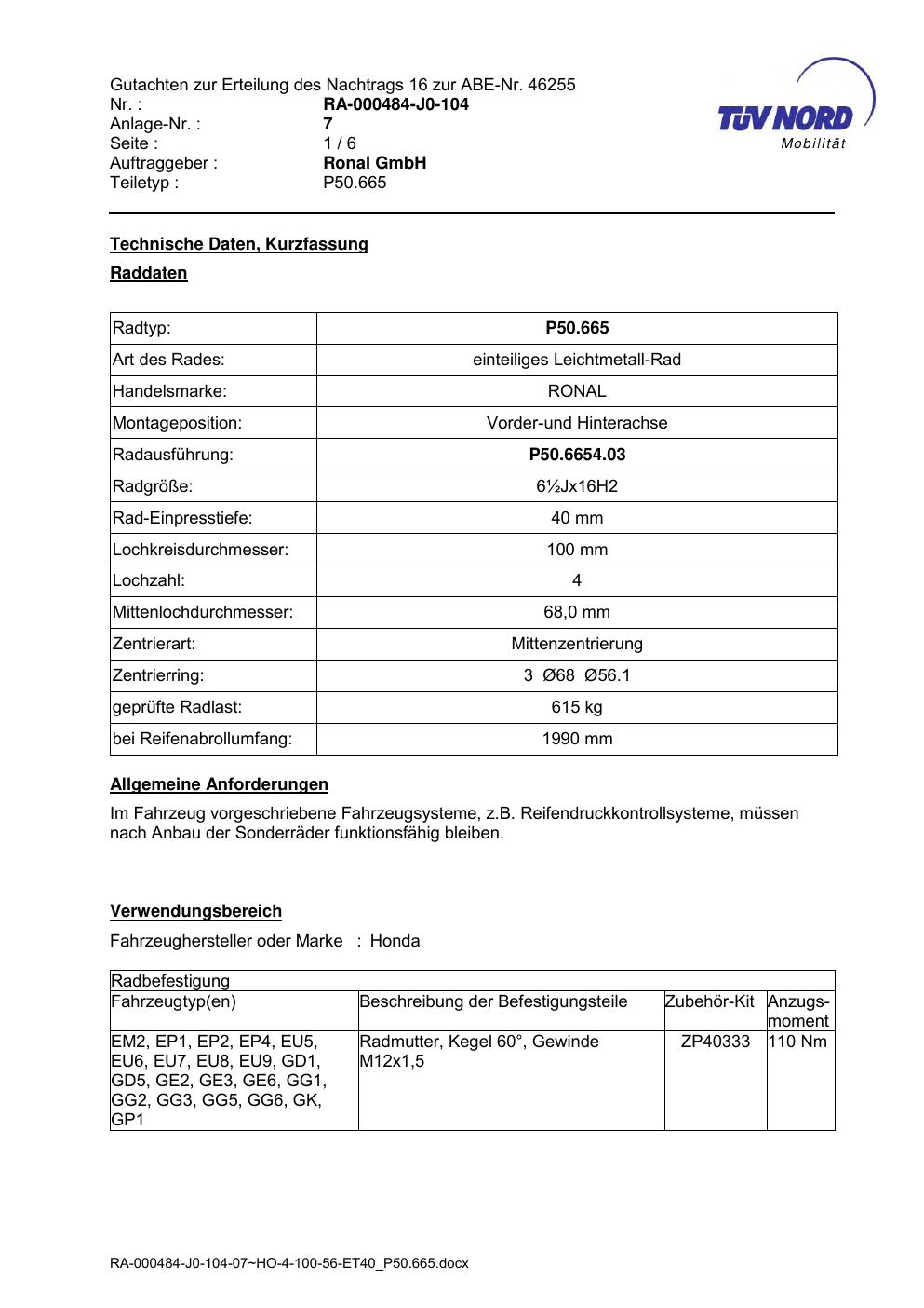 Dieses Gutachten (abe) bezieht sich auf die Alufelge Ronal P50.665 in der Ausführung ET 0, Mittenloch 0 mm (KBA 46255). Im PDF findest du typischerweise zulässige Reifengrößen, Auflagen/Anbauhinweise und – je nach Dokument – Hinweise zur Eintragung.
