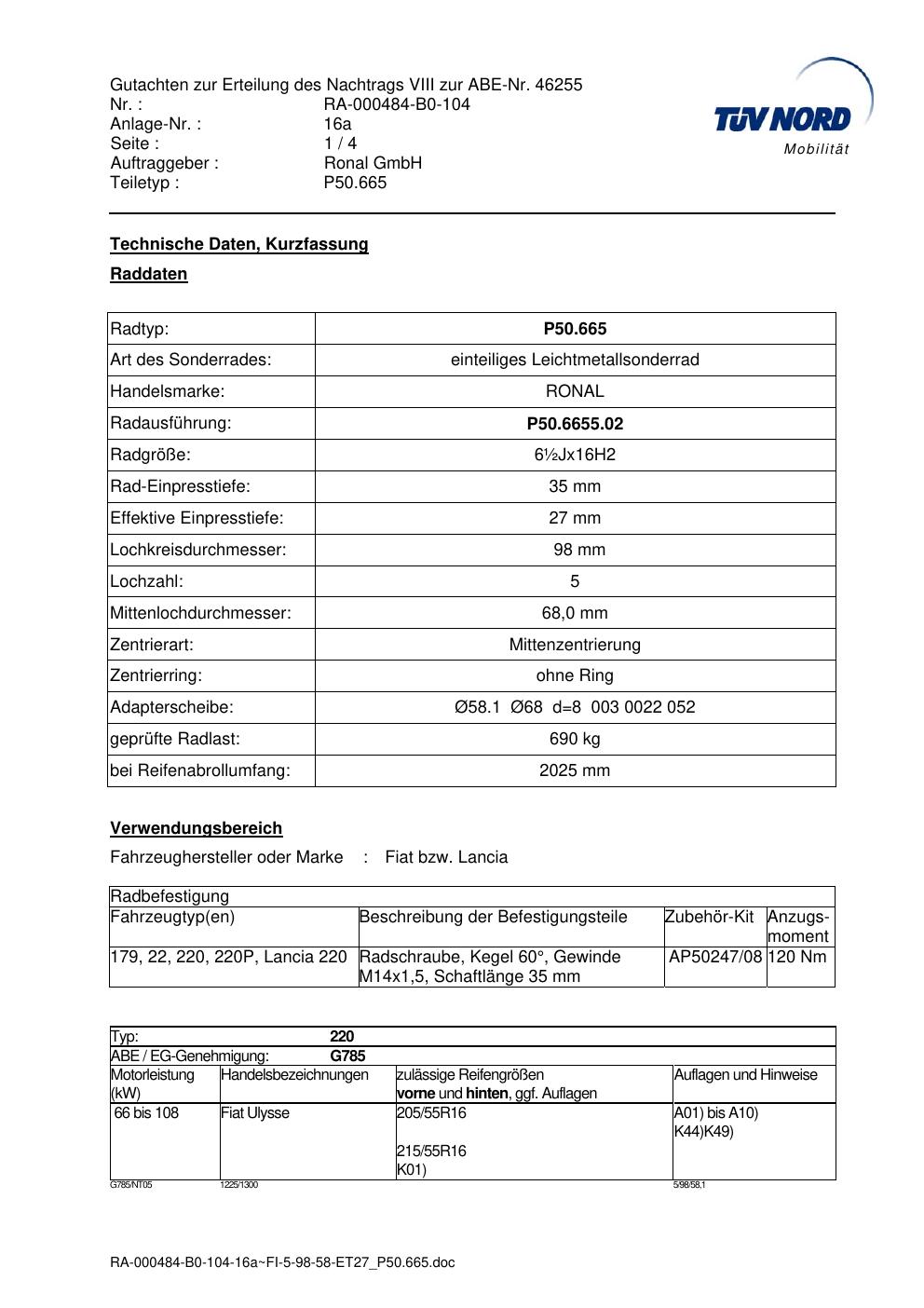 Dieses abe gehört zur Felge Ronal P50.665 in ET0 mit KBA 46255. Die Seite ist dafür gedacht, dass du schnell prüfen kannst, ob KBA, Design und Größe zu deiner Felge passen und danach direkt das richtige PDF lädst.