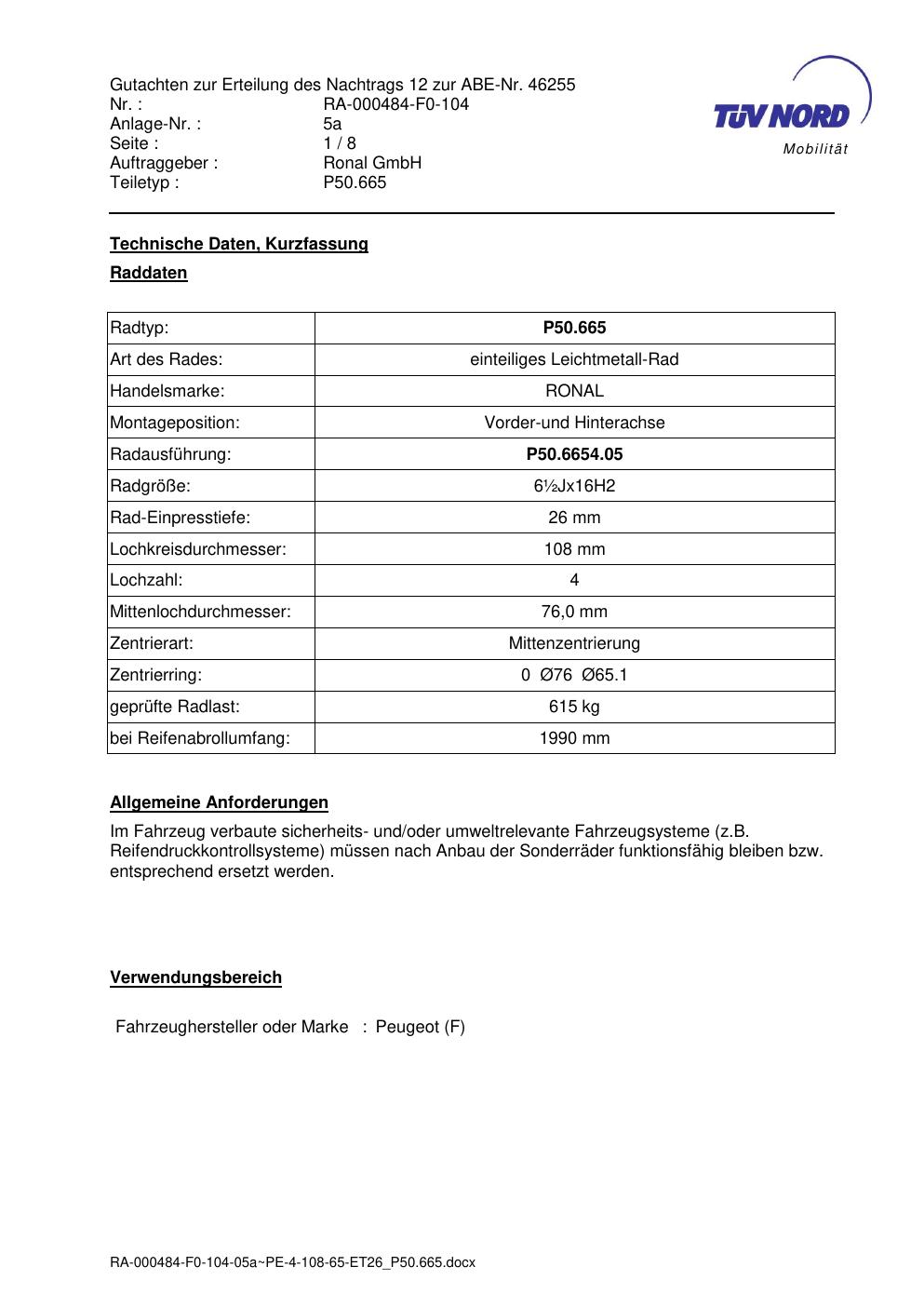 Dieses Gutachten (abe) bezieht sich auf die Alufelge Ronal P50.665 in der Ausführung ET 0, Mittenloch 0 mm (KBA 46255). Im PDF findest du typischerweise zulässige Reifengrößen, Auflagen/Anbauhinweise und – je nach Dokument – Hinweise zur Eintragung.