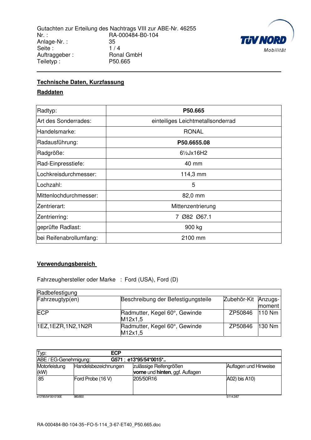Dieses Gutachten (abe) bezieht sich auf die Alufelge Ronal P50.665 in der Ausführung ET 0, Mittenloch 0 mm (KBA 46255). Im PDF findest du typischerweise zulässige Reifengrößen, Auflagen/Anbauhinweise und – je nach Dokument – Hinweise zur Eintragung.