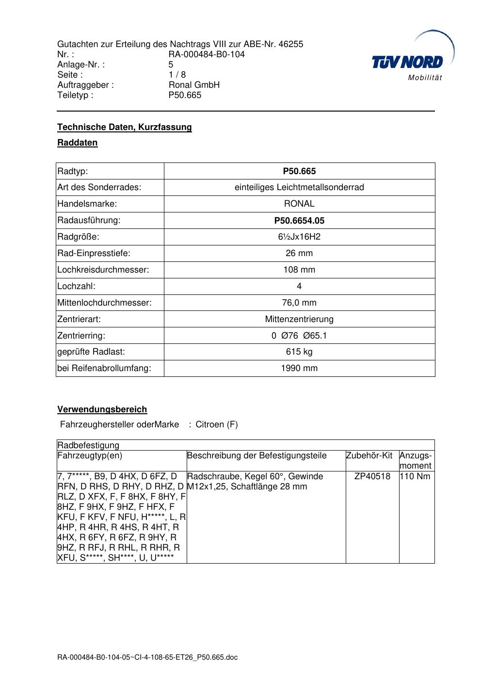 Dieses abe gehört zur Felge Ronal P50.665 in ET0 mit KBA 46255. Die Seite ist dafür gedacht, dass du schnell prüfen kannst, ob KBA, Design und Größe zu deiner Felge passen und danach direkt das richtige PDF lädst.