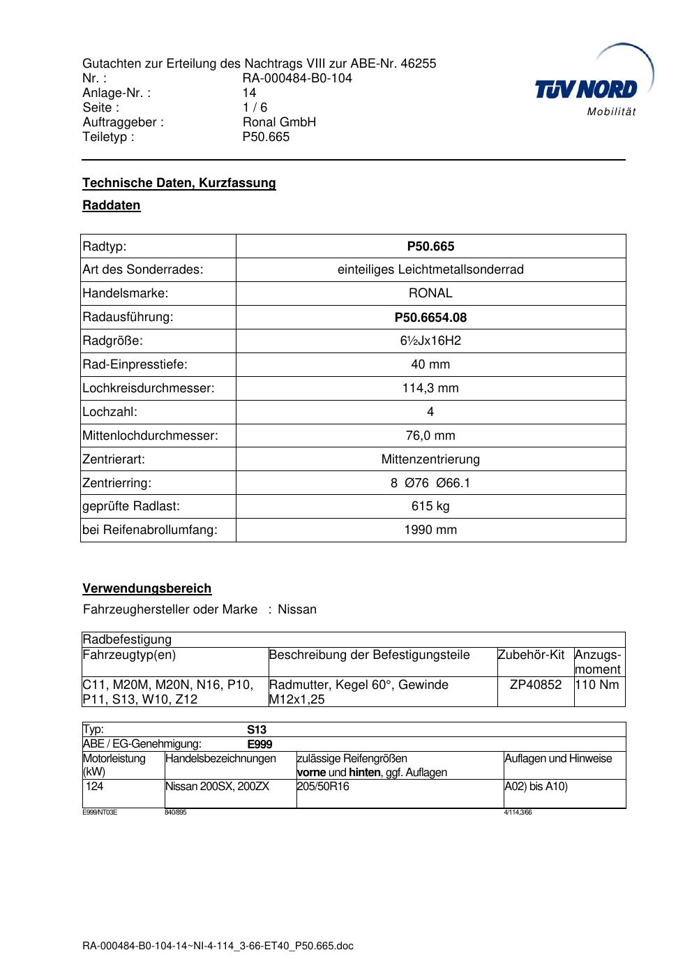 Dieses Gutachten (abe) bezieht sich auf die Alufelge Ronal P50.665 in der Ausführung ET 0, Mittenloch 0 mm (KBA 46255). Im PDF findest du typischerweise zulässige Reifengrößen, Auflagen/Anbauhinweise und – je nach Dokument – Hinweise zur Eintragung.
