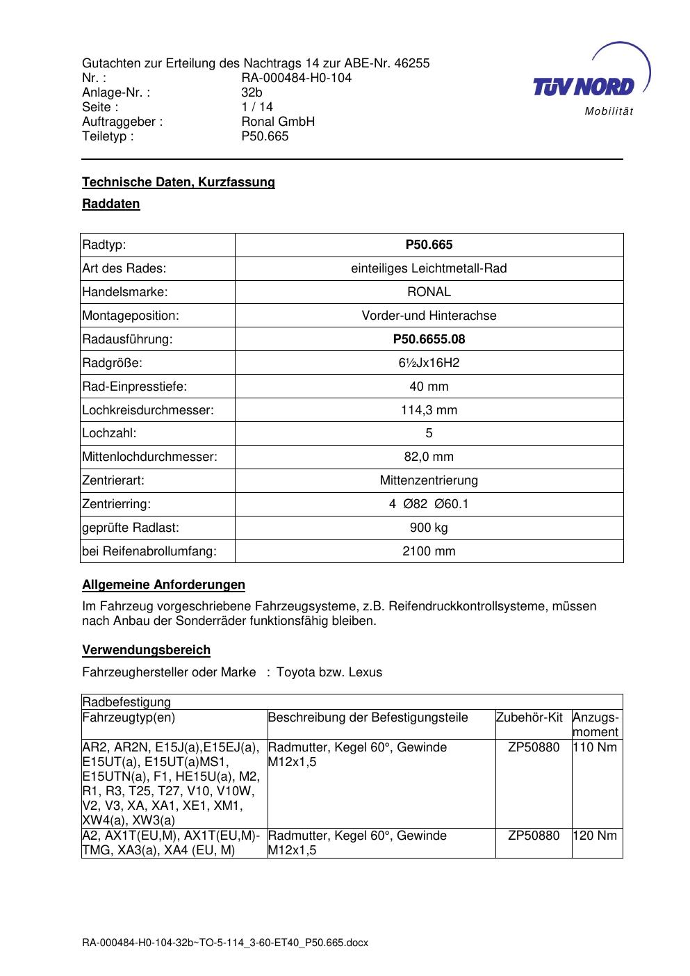 Dieses Gutachten (abe) bezieht sich auf die Alufelge Ronal P50.665 in der Ausführung ET 0, Mittenloch 0 mm (KBA 46255). Im PDF findest du typischerweise zulässige Reifengrößen, Auflagen/Anbauhinweise und – je nach Dokument – Hinweise zur Eintragung.