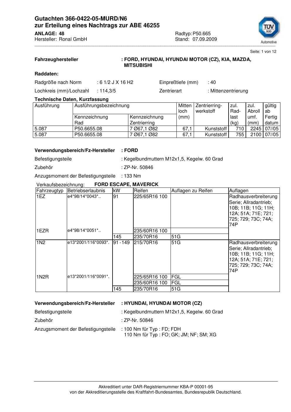 Felgengutachten / abe für Alufelgen Ronal P50.665 (2Jx16 ET 0, Mittenloch 0 mm) mit KBA 46255 (Zertifikatsnummer 46255). Hier kostenlos als PDF herunterladen. Der Download-Link ist 24 Stunden gültig und kann bis zu zwei Mal verwendet werden.