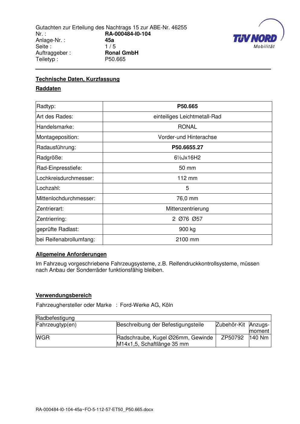 Dieses Gutachten (abe) bezieht sich auf die Alufelge Ronal P50.665 in der Ausführung ET 0, Mittenloch 0 mm (KBA 46255). Im PDF findest du typischerweise zulässige Reifengrößen, Auflagen/Anbauhinweise und – je nach Dokument – Hinweise zur Eintragung.