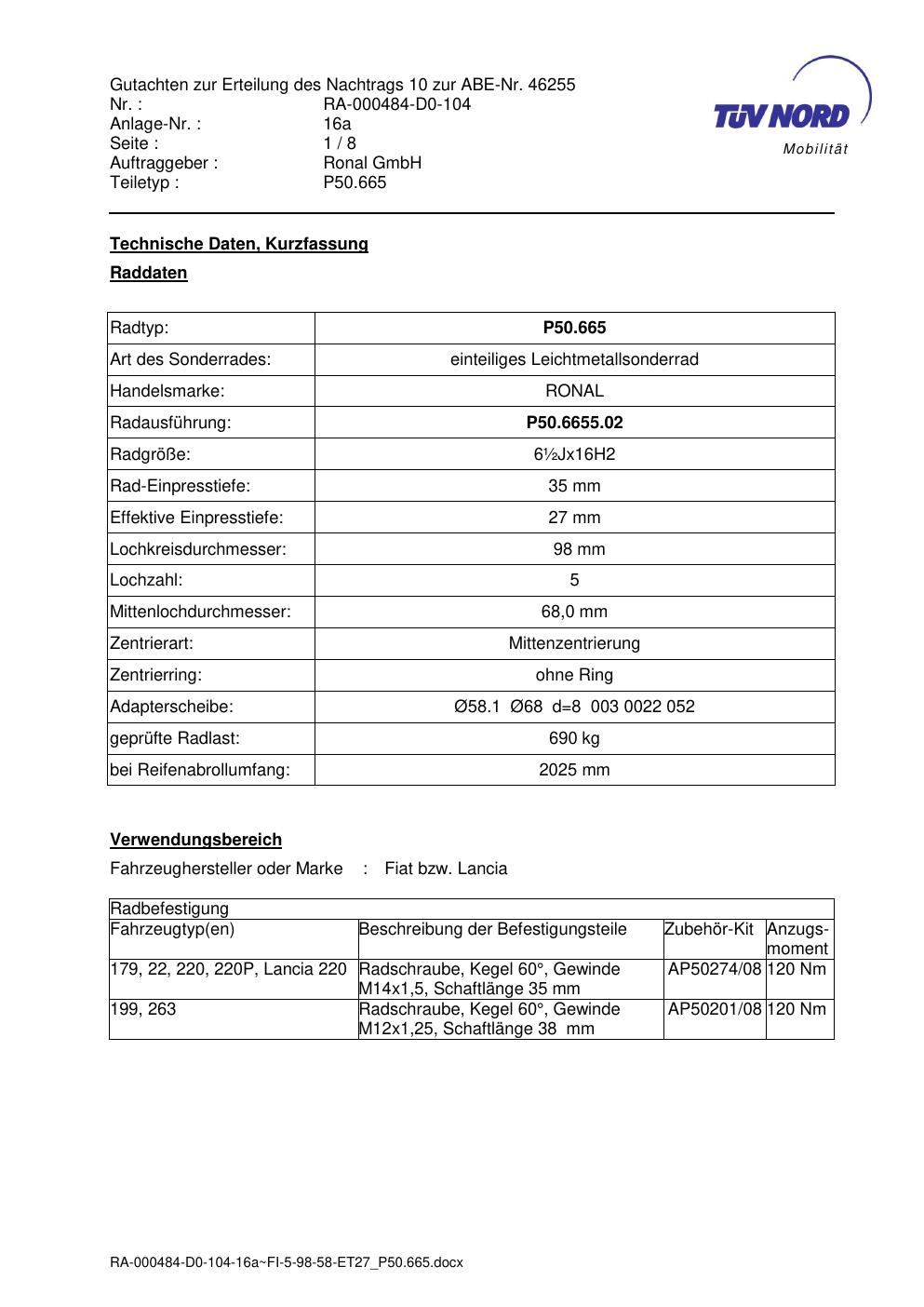 Dieses Gutachten (abe) bezieht sich auf die Alufelge Ronal P50.665 in der Ausführung ET 0, Mittenloch 0 mm (KBA 46255). Im PDF findest du typischerweise zulässige Reifengrößen, Auflagen/Anbauhinweise und – je nach Dokument – Hinweise zur Eintragung.