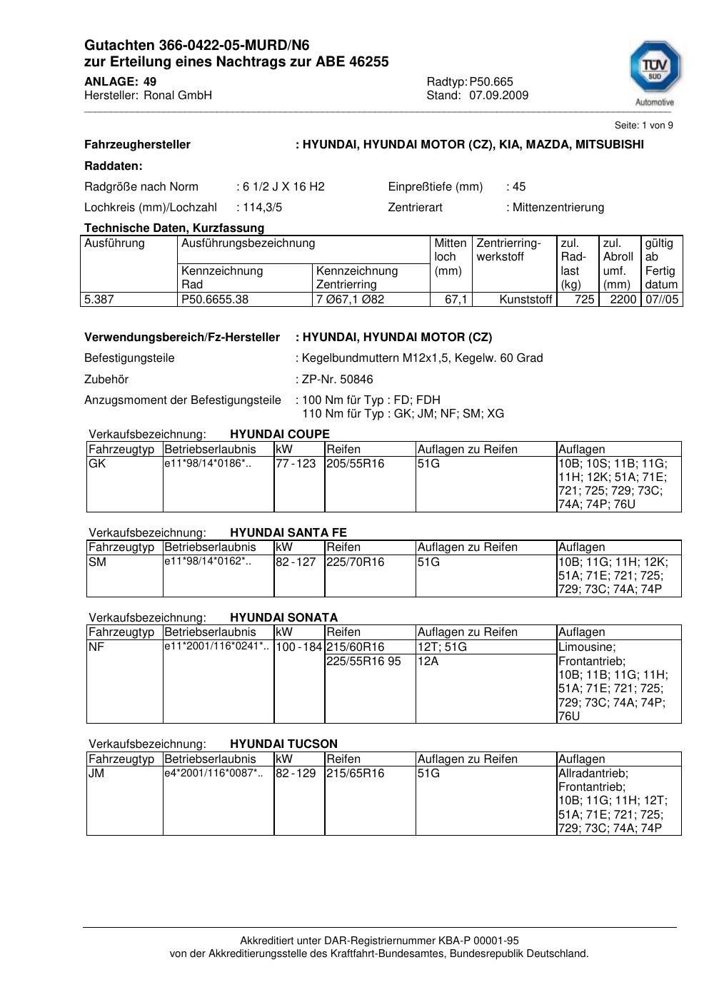 Felgengutachten / abe für Alufelgen Ronal P50.665 (2Jx16 ET 0, Mittenloch 0 mm) mit KBA 46255 (Zertifikatsnummer 46255). Hier kostenlos als PDF herunterladen. Der Download-Link ist 24 Stunden gültig und kann bis zu zwei Mal verwendet werden.