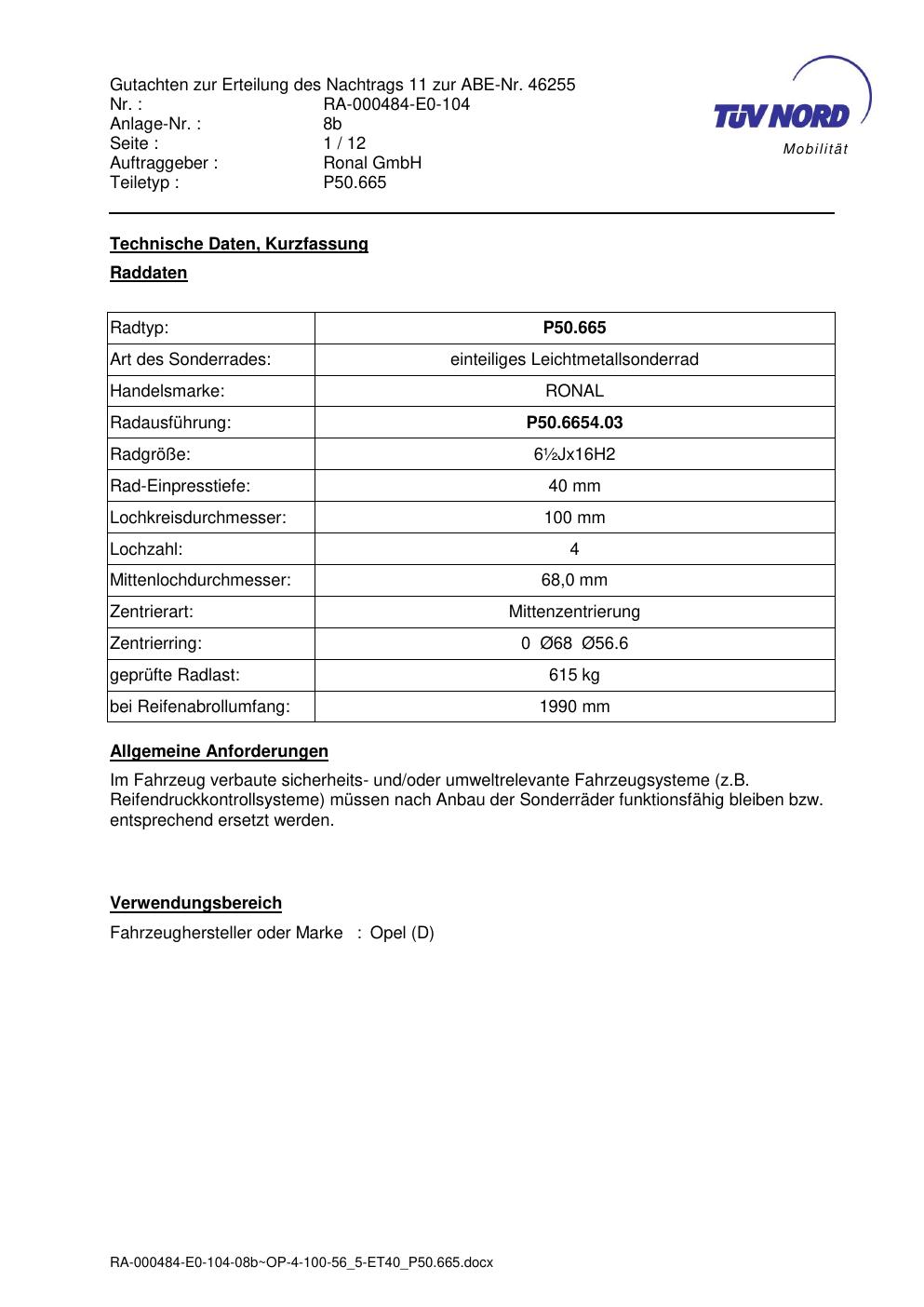 Dieses Gutachten (abe) bezieht sich auf die Alufelge Ronal P50.665 in der Ausführung ET 0, Mittenloch 0 mm (KBA 46255). Im PDF findest du typischerweise zulässige Reifengrößen, Auflagen/Anbauhinweise und – je nach Dokument – Hinweise zur Eintragung.