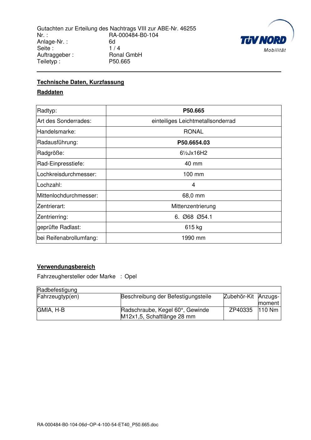 Dieses Gutachten (abe) bezieht sich auf die Alufelge Ronal P50.665 in der Ausführung ET 0, Mittenloch 0 mm (KBA 46255). Im PDF findest du typischerweise zulässige Reifengrößen, Auflagen/Anbauhinweise und – je nach Dokument – Hinweise zur Eintragung.