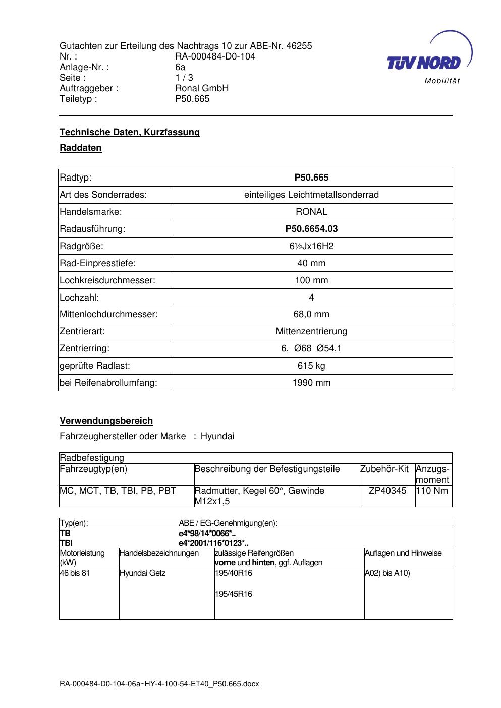 Dieses Gutachten (abe) bezieht sich auf die Alufelge Ronal P50.665 in der Ausführung ET 0, Mittenloch 0 mm (KBA 46255). Im PDF findest du typischerweise zulässige Reifengrößen, Auflagen/Anbauhinweise und – je nach Dokument – Hinweise zur Eintragung.