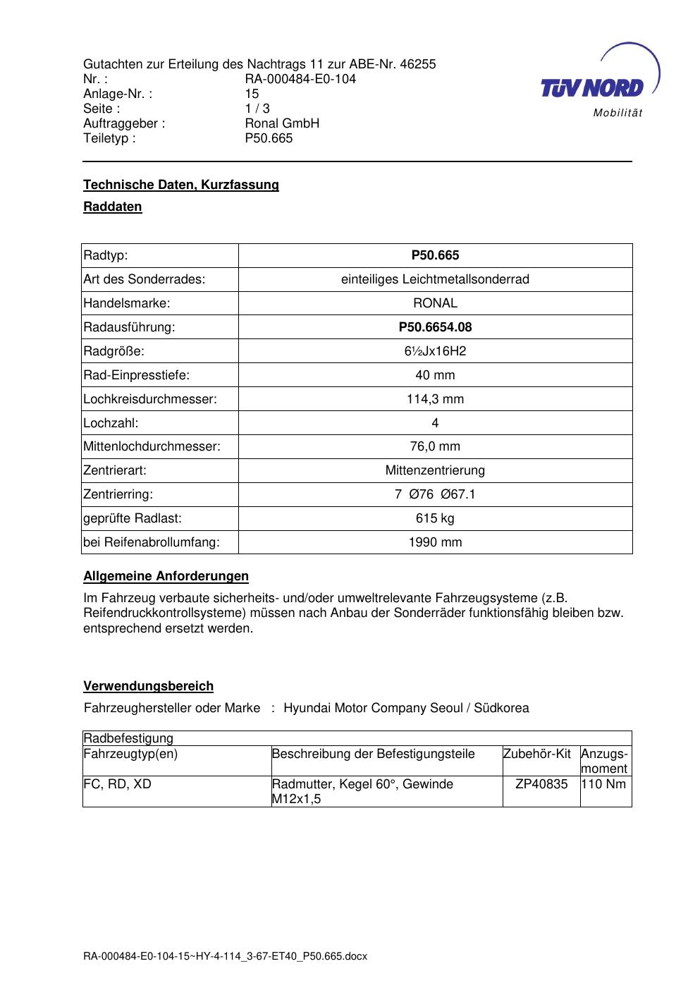 Dieses Gutachten (abe) bezieht sich auf die Alufelge Ronal P50.665 in der Ausführung ET 0, Mittenloch 0 mm (KBA 46255). Im PDF findest du typischerweise zulässige Reifengrößen, Auflagen/Anbauhinweise und – je nach Dokument – Hinweise zur Eintragung.