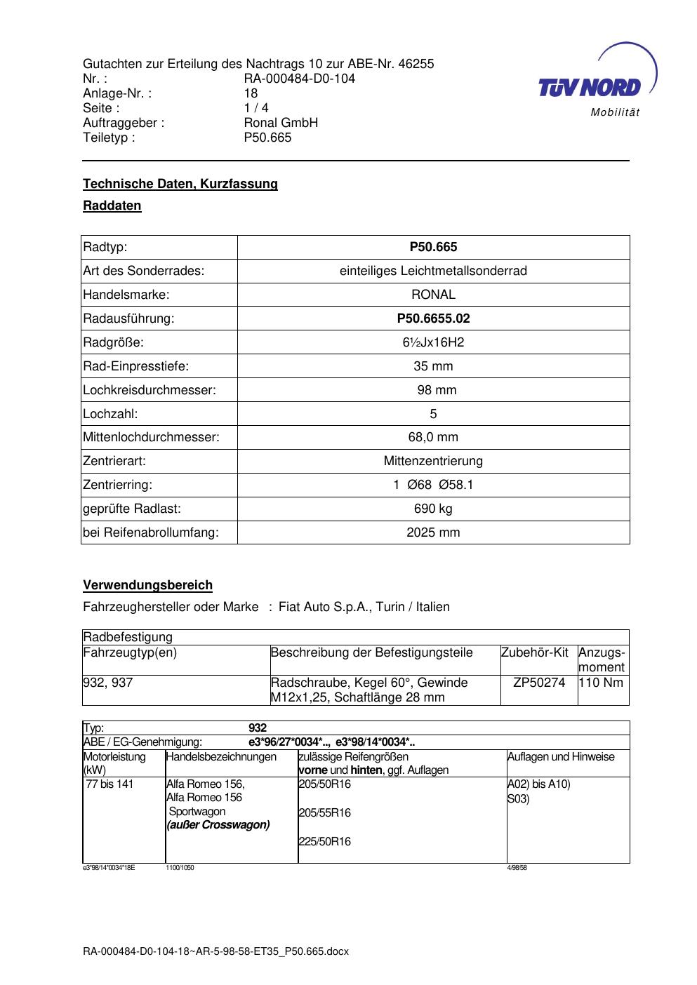 Dieses abe gehört zur Felge Ronal P50.665 in ET0 mit KBA 46255. Die Seite ist dafür gedacht, dass du schnell prüfen kannst, ob KBA, Design und Größe zu deiner Felge passen und danach direkt das richtige PDF lädst.