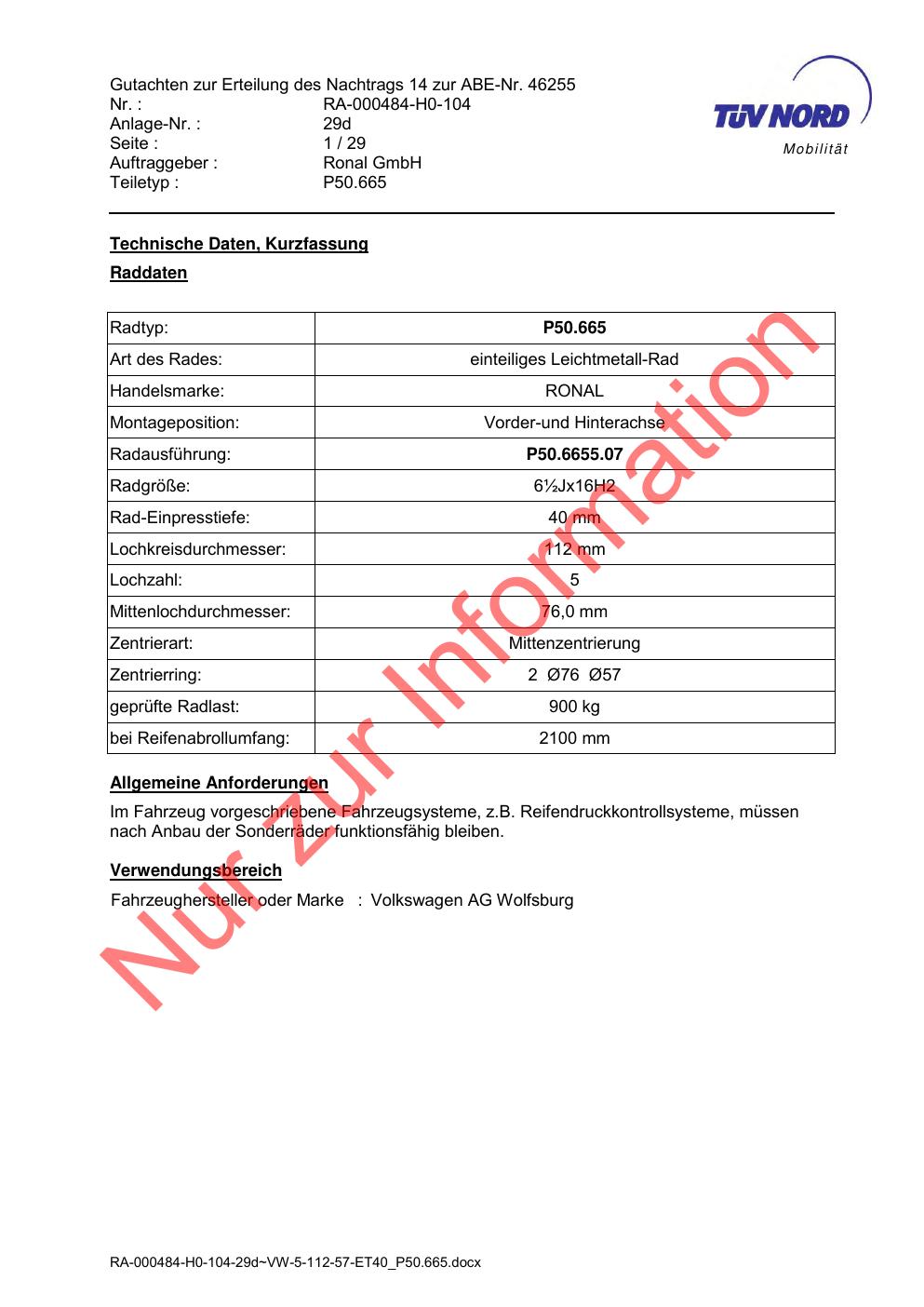 Dieses Gutachten (abe) bezieht sich auf die Alufelge Ronal P50.665 in der Ausführung ET 0, Mittenloch 0 mm (KBA 46255). Im PDF findest du typischerweise zulässige Reifengrößen, Auflagen/Anbauhinweise und – je nach Dokument – Hinweise zur Eintragung.