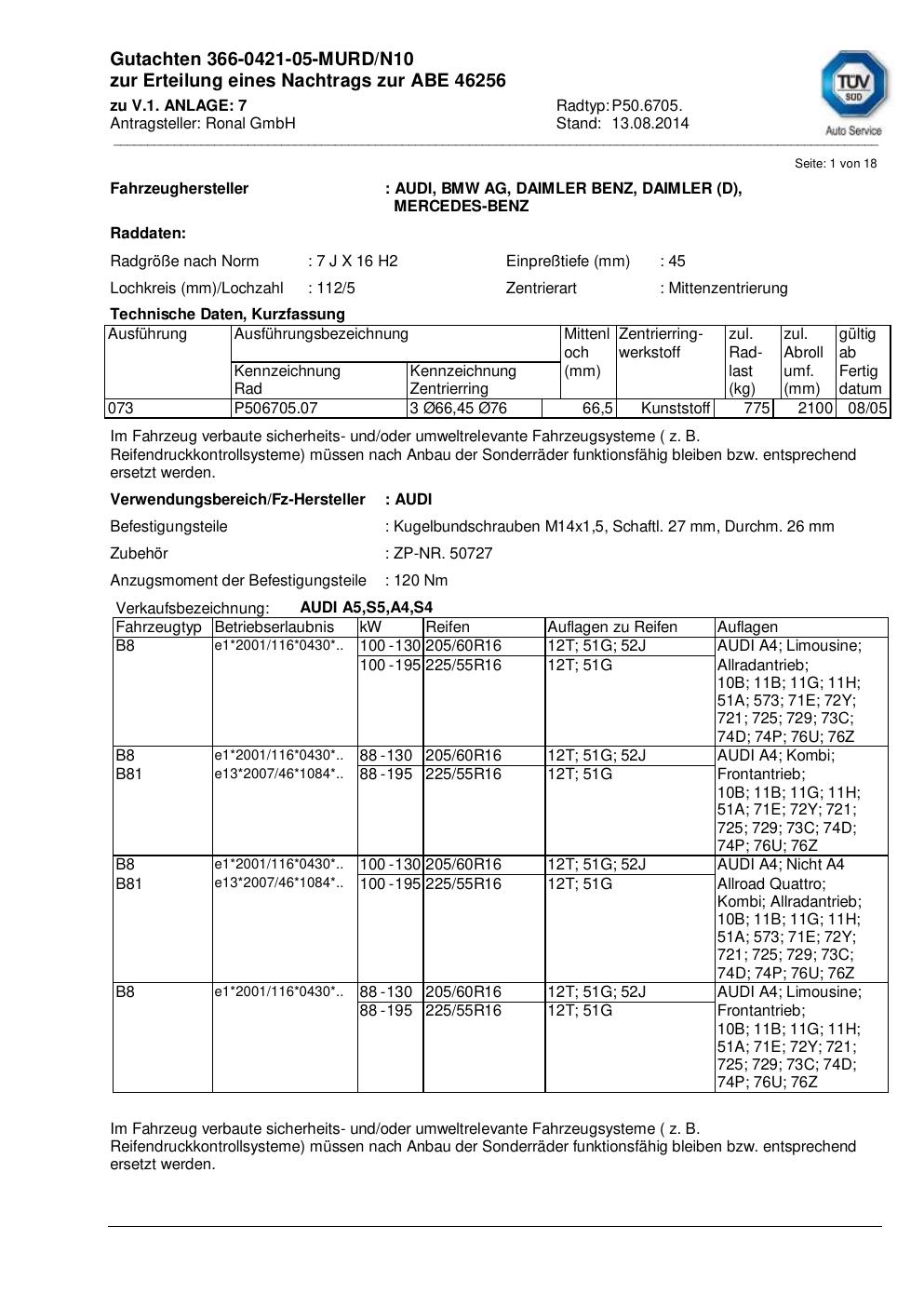 Dieses Gutachten (abe) bezieht sich auf die Alufelge ATS P50.6705 in der Ausführung 7Jx16 ET 0, Mittenloch 0 mm (KBA 46256). Im PDF findest du typischerweise zulässige Reifengrößen, Auflagen/Anbauhinweise und – je nach Dokument – Hinweise zur Eintragung.