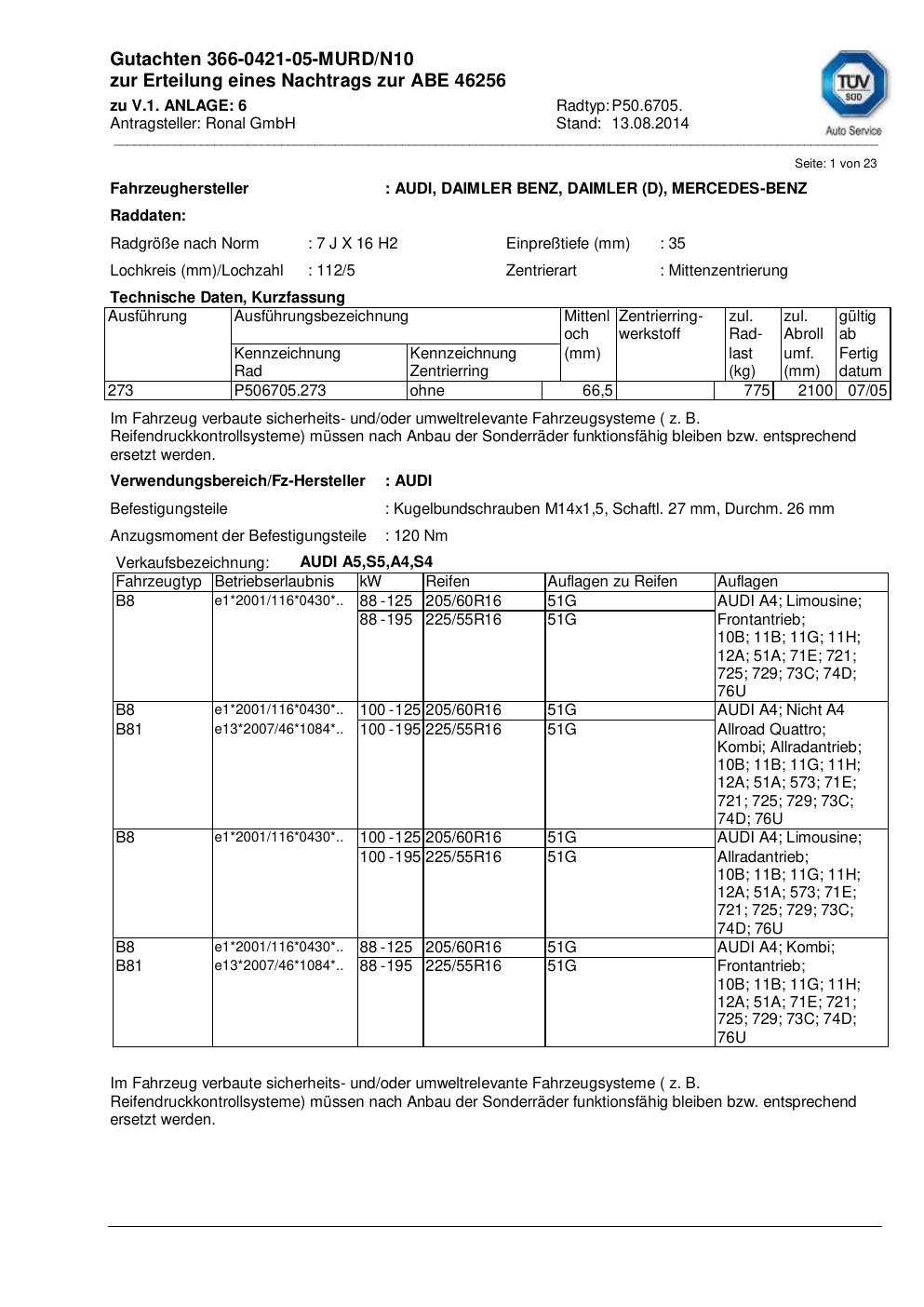 Felgengutachten / abe für Alufelgen Ronal P50.6705 (7Jx16 ET 0, Mittenloch 0 mm) mit KBA 46256 (Zertifikatsnummer 46256). Hier kostenlos als PDF herunterladen. Der Download-Link ist 24 Stunden gültig und kann bis zu zwei Mal verwendet werden.