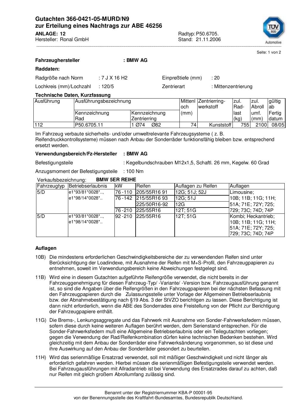 Dieses Gutachten (abe) bezieht sich auf die Alufelge Ronal P50.6705 in der Ausführung 7Jx16 ET 0, Mittenloch 0 mm (KBA 46256). Im PDF findest du typischerweise zulässige Reifengrößen, Auflagen/Anbauhinweise und – je nach Dokument – Hinweise zur Eintragung.
