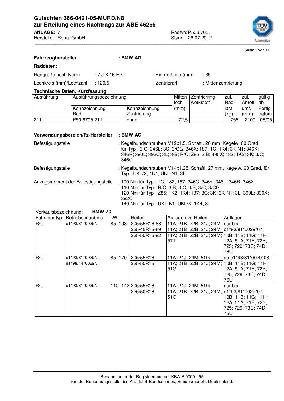 Dieses Gutachten (abe) bezieht sich auf die Alufelge Ronal P50.6705 in der Ausführung 7Jx16 ET 0, Mittenloch 0 mm (KBA 46256). Im PDF findest du typischerweise zulässige Reifengrößen, Auflagen/Anbauhinweise und – je nach Dokument – Hinweise zur Eintragung.