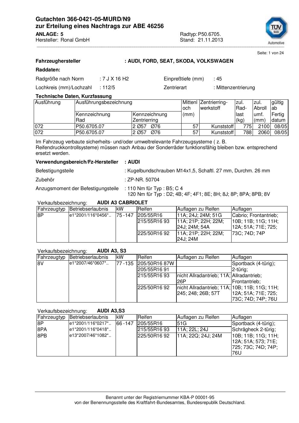 Dieses Gutachten (abe) bezieht sich auf die Alufelge Ronal P50.6705 in der Ausführung 7Jx16 ET 0, Mittenloch 0 mm (KBA 46256). Im PDF findest du typischerweise zulässige Reifengrößen, Auflagen/Anbauhinweise und – je nach Dokument – Hinweise zur Eintragung.