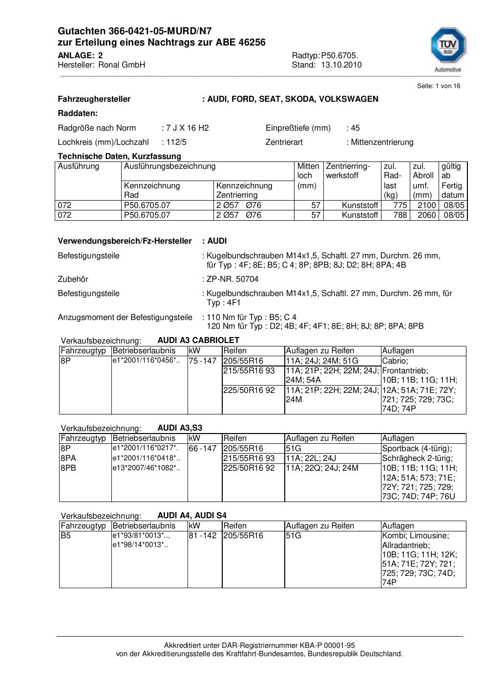 Dieses Gutachten (abe) bezieht sich auf die Alufelge Ronal P50.6705 in der Ausführung 7Jx16 ET 0, Mittenloch 0 mm (KBA 46256). Im PDF findest du typischerweise zulässige Reifengrößen, Auflagen/Anbauhinweise und – je nach Dokument – Hinweise zur Eintragung.