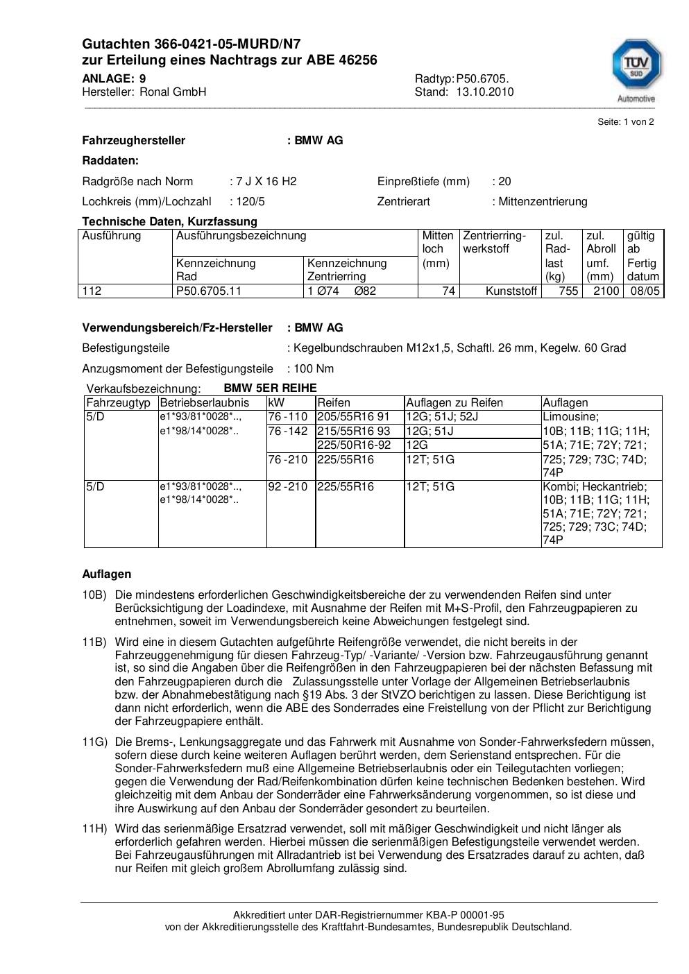 Dieses Gutachten (abe) bezieht sich auf die Alufelge Ronal P50.6705 in der Ausführung 7Jx16 ET 0, Mittenloch 0 mm (KBA 46256). Im PDF findest du typischerweise zulässige Reifengrößen, Auflagen/Anbauhinweise und – je nach Dokument – Hinweise zur Eintragung.