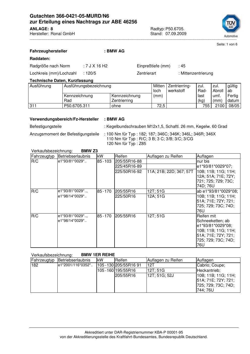 Felgengutachten / abe für Alufelgen Ronal P50.6705 (7Jx16 ET 0, Mittenloch 0 mm) mit KBA 46256 (Zertifikatsnummer 46256). Hier kostenlos als PDF herunterladen. Der Download-Link ist 24 Stunden gültig und kann bis zu zwei Mal verwendet werden.