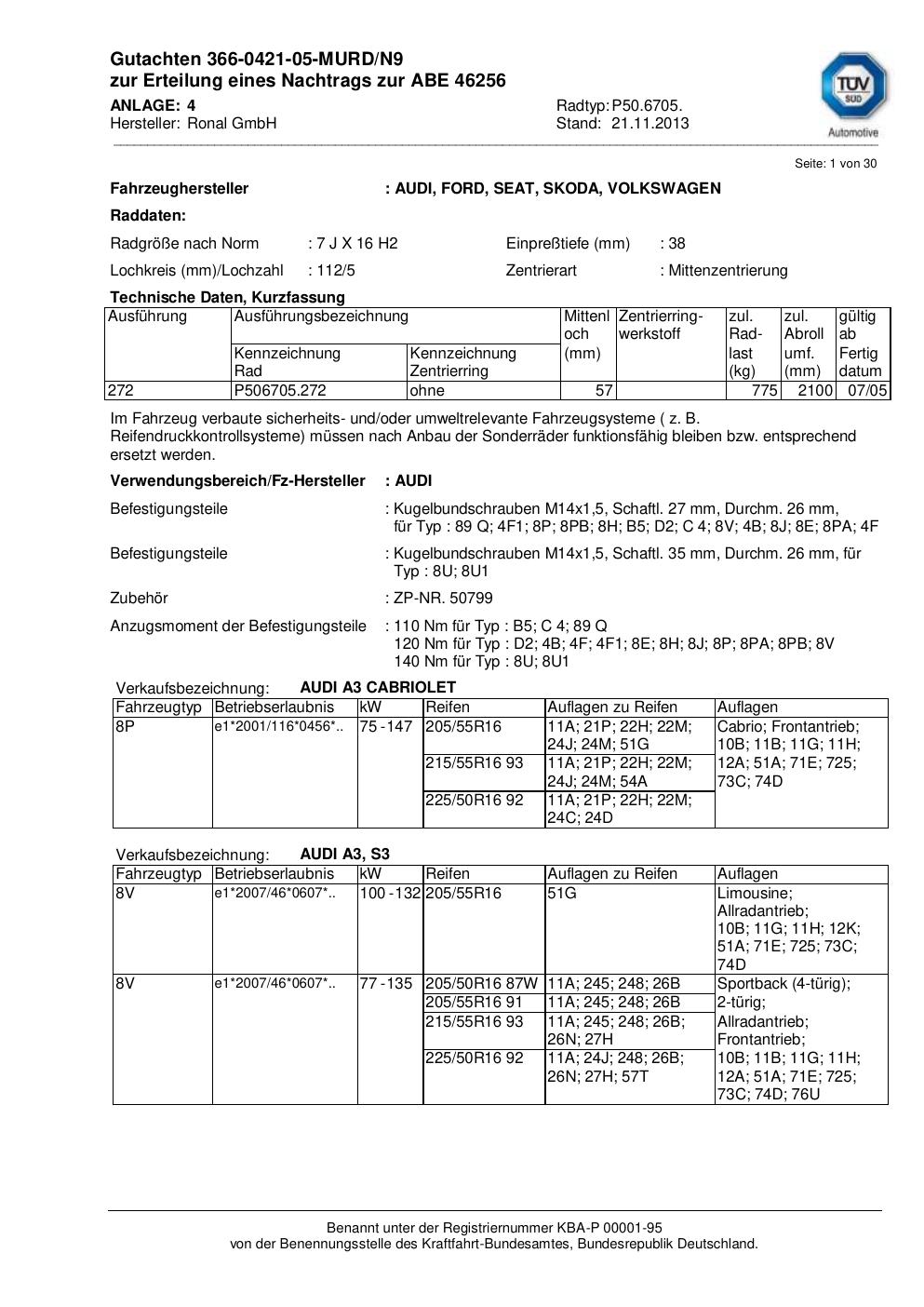 Dieses Gutachten (abe) bezieht sich auf die Alufelge Ronal P50.6705 in der Ausführung 7Jx16 ET 0, Mittenloch 0 mm (KBA 46256). Im PDF findest du typischerweise zulässige Reifengrößen, Auflagen/Anbauhinweise und – je nach Dokument – Hinweise zur Eintragung.