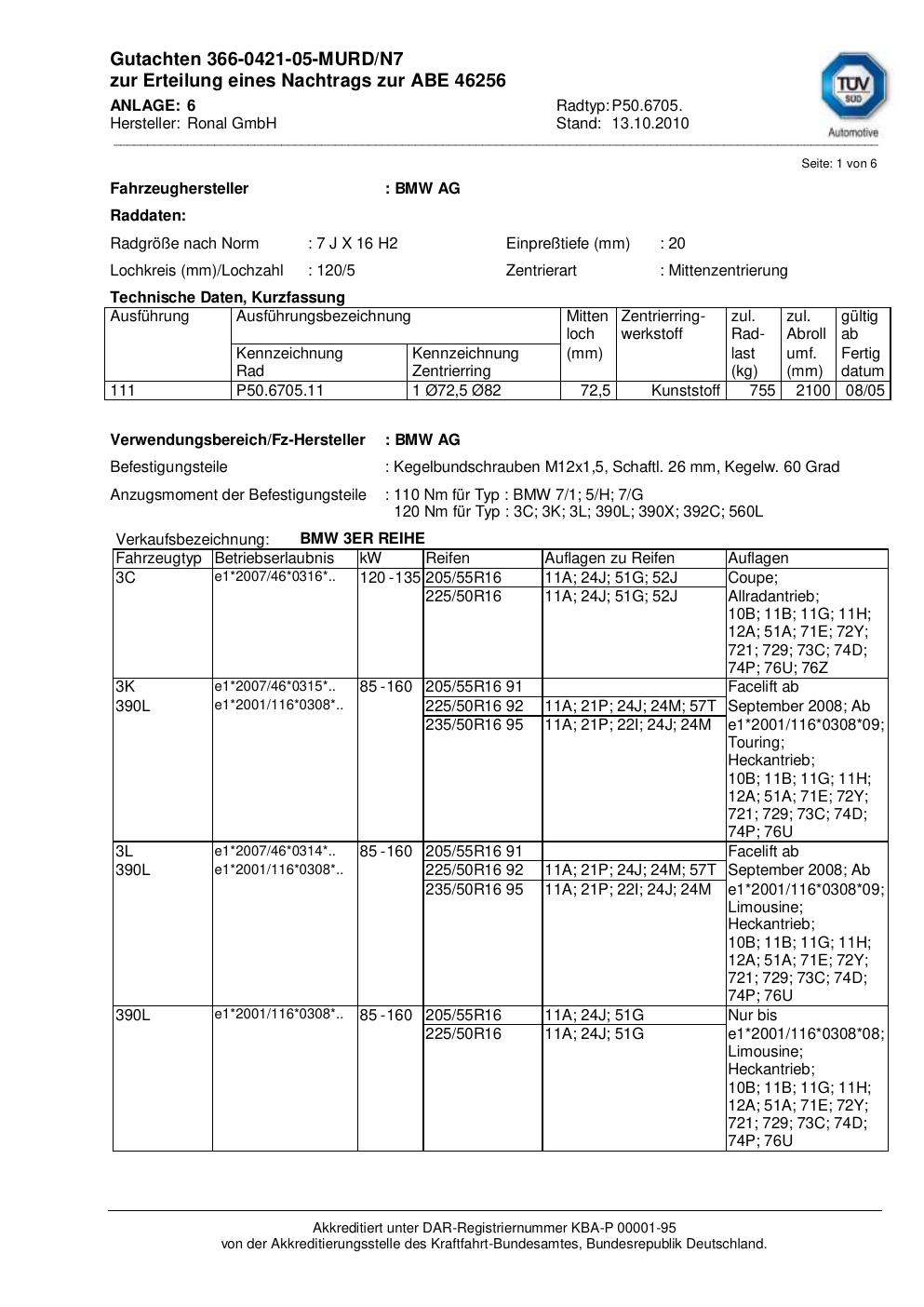 Felgengutachten / abe für Alufelgen Ronal P50.6705 (7Jx16 ET 0, Mittenloch 0 mm) mit KBA 46256 (Zertifikatsnummer 46256). Hier kostenlos als PDF herunterladen. Der Download-Link ist 24 Stunden gültig und kann bis zu zwei Mal verwendet werden.