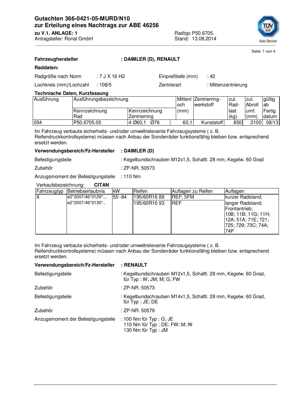 Dieses Gutachten (abe) bezieht sich auf die Alufelge Ronal P50.6705 in der Ausführung 7Jx16 ET 0, Mittenloch 0 mm (KBA 46256). Im PDF findest du typischerweise zulässige Reifengrößen, Auflagen/Anbauhinweise und – je nach Dokument – Hinweise zur Eintragung.