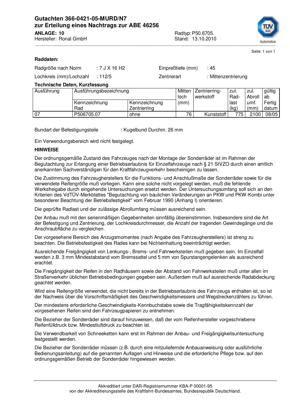 Dieses Gutachten (abe) bezieht sich auf die Alufelge Ronal P50.6705 in der Ausführung 7Jx16 ET 0, Mittenloch 0 mm (KBA 46256). Im PDF findest du typischerweise zulässige Reifengrößen, Auflagen/Anbauhinweise und – je nach Dokument – Hinweise zur Eintragung.