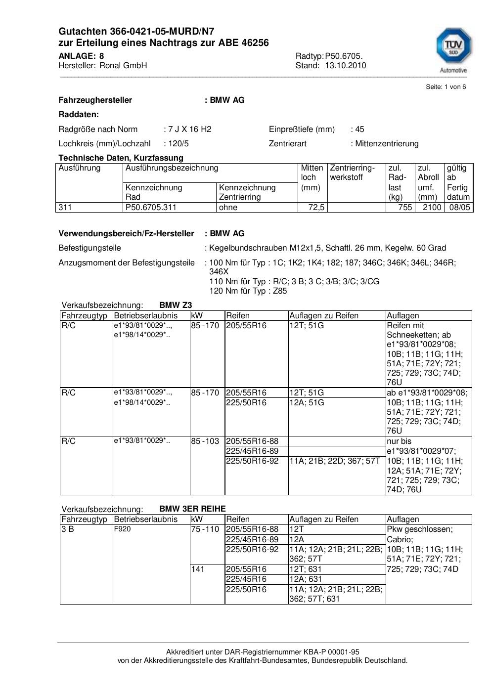 Dieses Gutachten (abe) bezieht sich auf die Alufelge Ronal P50.6705 in der Ausführung 7Jx16 ET 0, Mittenloch 0 mm (KBA 46256). Im PDF findest du typischerweise zulässige Reifengrößen, Auflagen/Anbauhinweise und – je nach Dokument – Hinweise zur Eintragung.