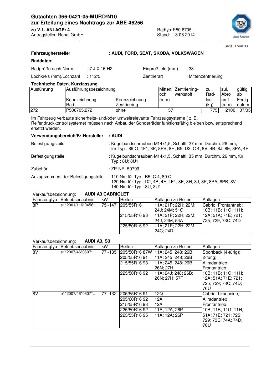Dieses Gutachten (abe) bezieht sich auf die Alufelge Ronal P50.6705 in der Ausführung 7Jx16 ET 0, Mittenloch 0 mm (KBA 46256). Im PDF findest du typischerweise zulässige Reifengrößen, Auflagen/Anbauhinweise und – je nach Dokument – Hinweise zur Eintragung.