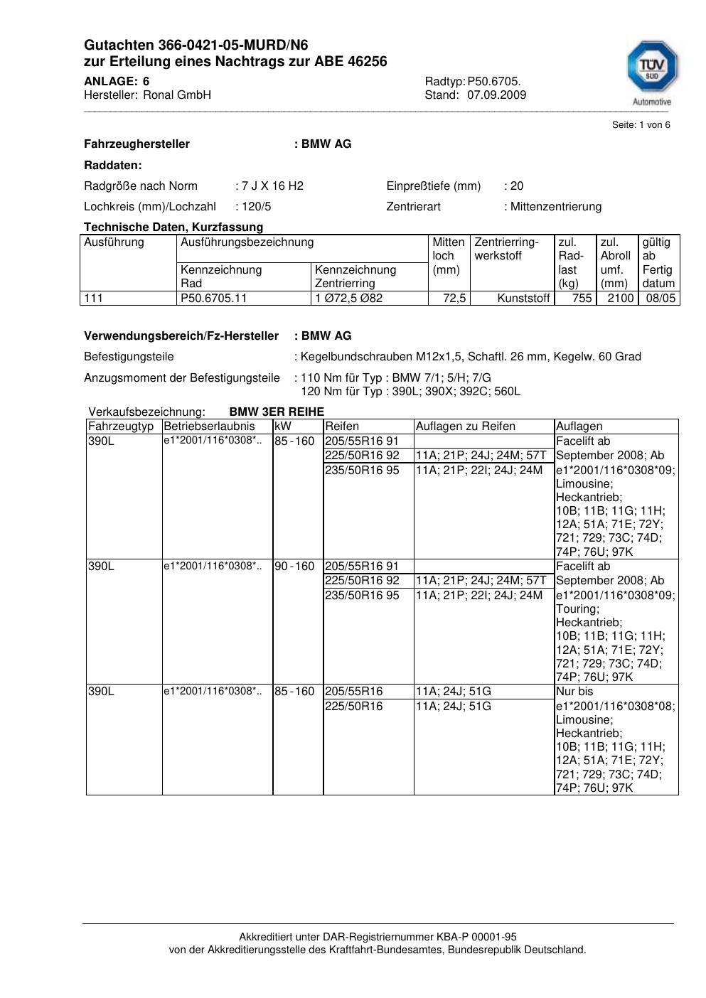 Dieses Gutachten (abe) bezieht sich auf die Alufelge Ronal P50.6705 in der Ausführung 7Jx16 ET 0, Mittenloch 0 mm (KBA 46256). Im PDF findest du typischerweise zulässige Reifengrößen, Auflagen/Anbauhinweise und – je nach Dokument – Hinweise zur Eintragung.