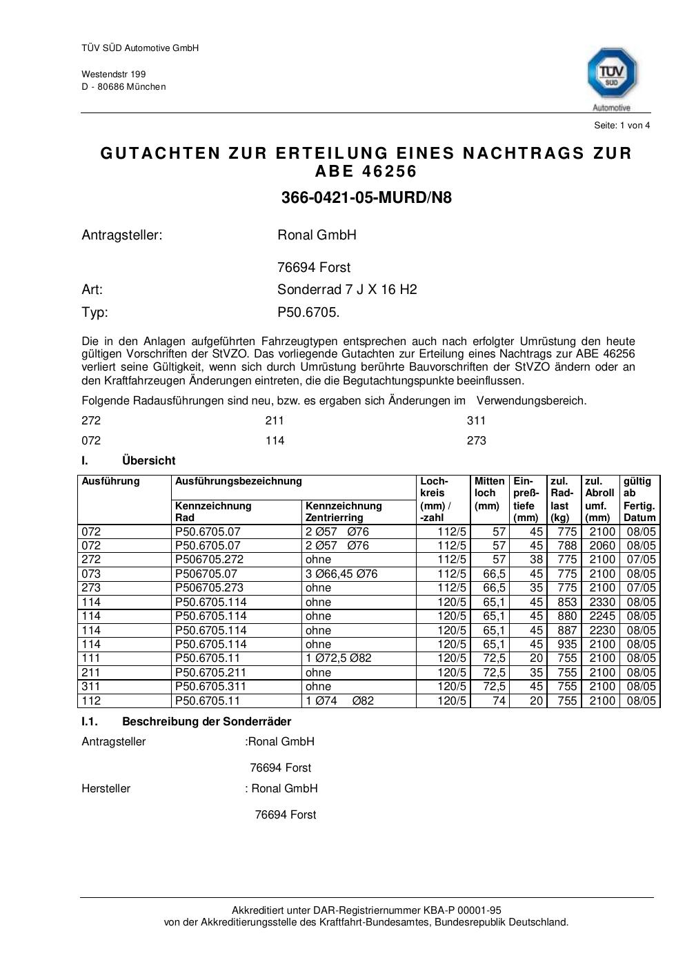 Dieses Gutachten (abe) bezieht sich auf die Alufelge Ronal P50.6705 in der Ausführung 7Jx16 ET 0, Mittenloch 0 mm (KBA 46256). Im PDF findest du typischerweise zulässige Reifengrößen, Auflagen/Anbauhinweise und – je nach Dokument – Hinweise zur Eintragung.