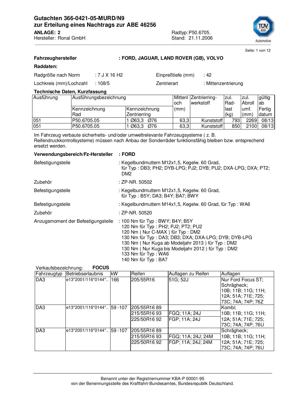 Dieses Gutachten (abe) bezieht sich auf die Alufelge Ronal P50.6705 in der Ausführung 7Jx16 ET 0, Mittenloch 0 mm (KBA 46256). Im PDF findest du typischerweise zulässige Reifengrößen, Auflagen/Anbauhinweise und – je nach Dokument – Hinweise zur Eintragung.