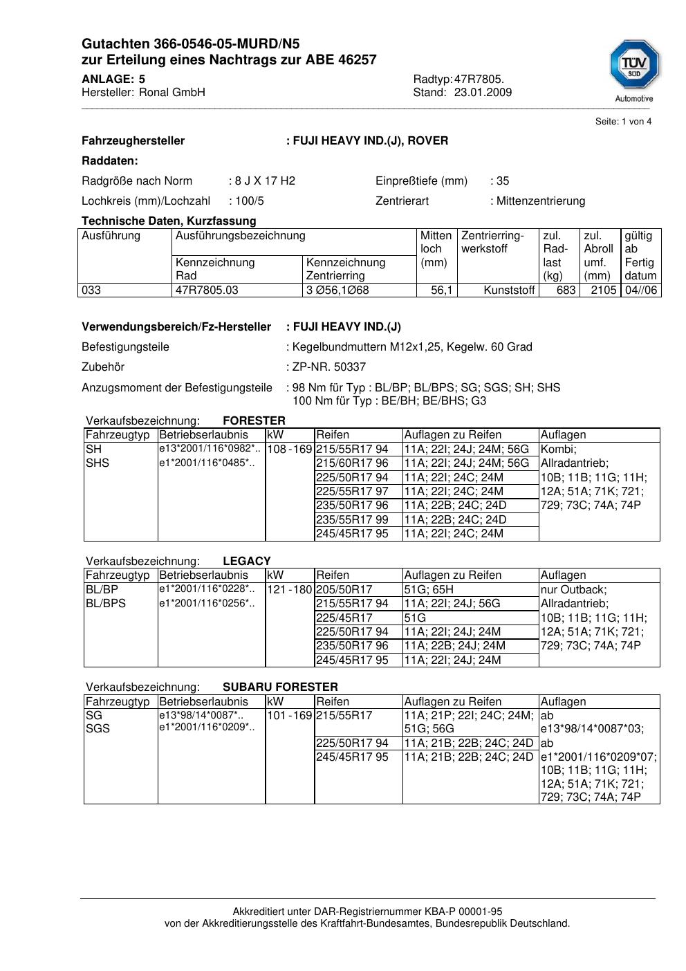Dieses Gutachten (abe) bezieht sich auf die Alufelge Ronal 47R7805 in der Ausführung 8Jx17 ET 0, Mittenloch 0 mm (KBA 46257). Im PDF findest du typischerweise zulässige Reifengrößen, Auflagen/Anbauhinweise und – je nach Dokument – Hinweise zur Eintragung.