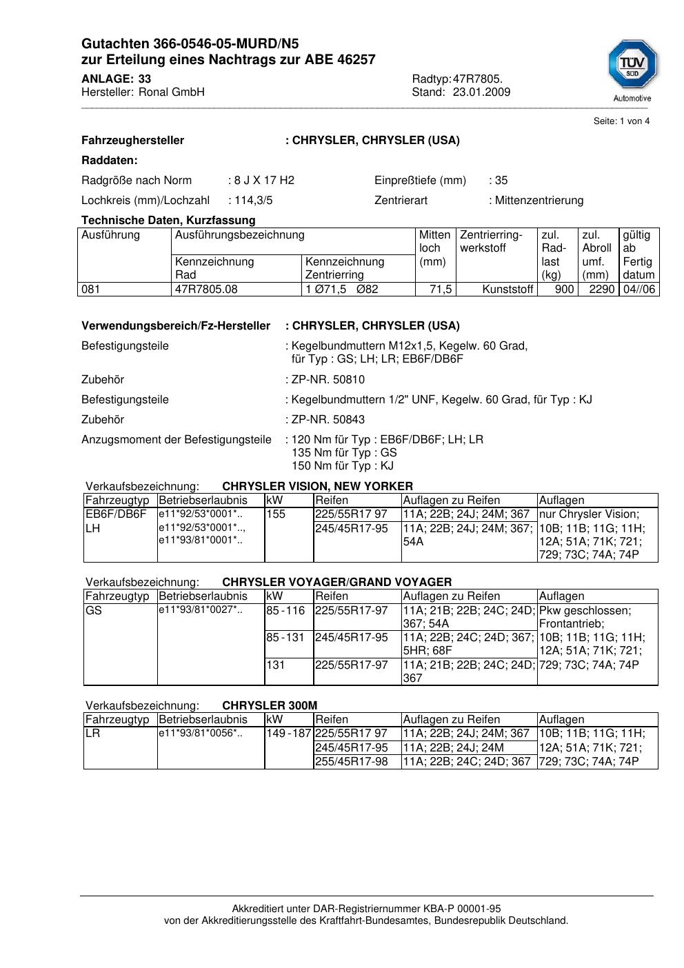Dieses Gutachten (abe) bezieht sich auf die Alufelge Ronal 47R7805 in der Ausführung 8Jx17 ET 0, Mittenloch 0 mm (KBA 46257). Im PDF findest du typischerweise zulässige Reifengrößen, Auflagen/Anbauhinweise und – je nach Dokument – Hinweise zur Eintragung.