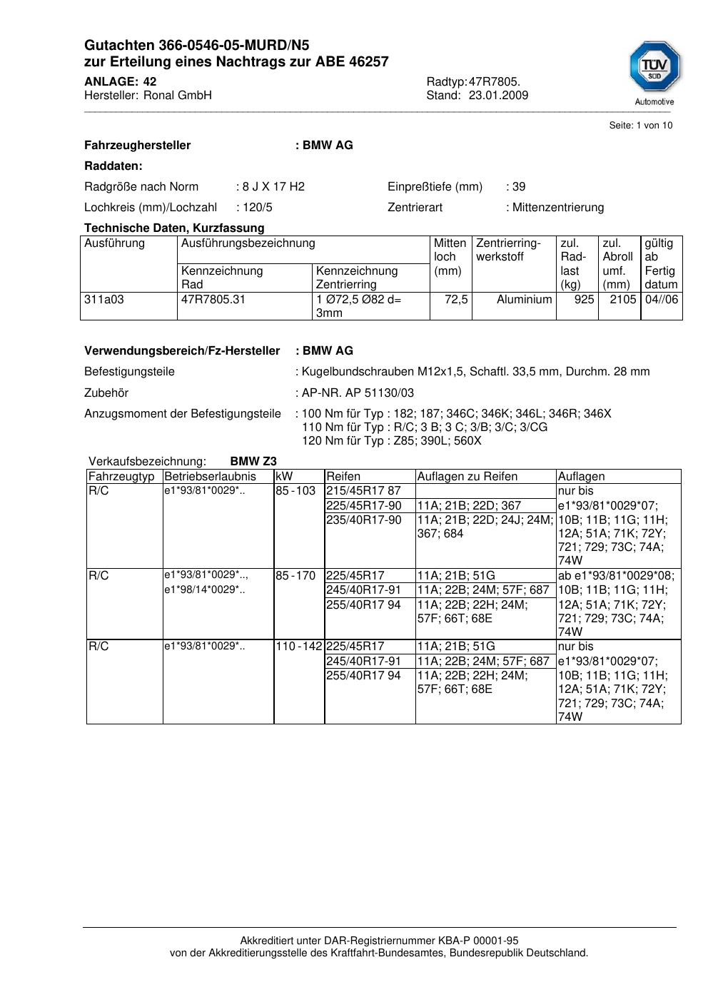 Dieses Gutachten (abe) bezieht sich auf die Alufelge Ronal 47R7805 in der Ausführung 8Jx17 ET 0, Mittenloch 0 mm (KBA 46257). Im PDF findest du typischerweise zulässige Reifengrößen, Auflagen/Anbauhinweise und – je nach Dokument – Hinweise zur Eintragung.