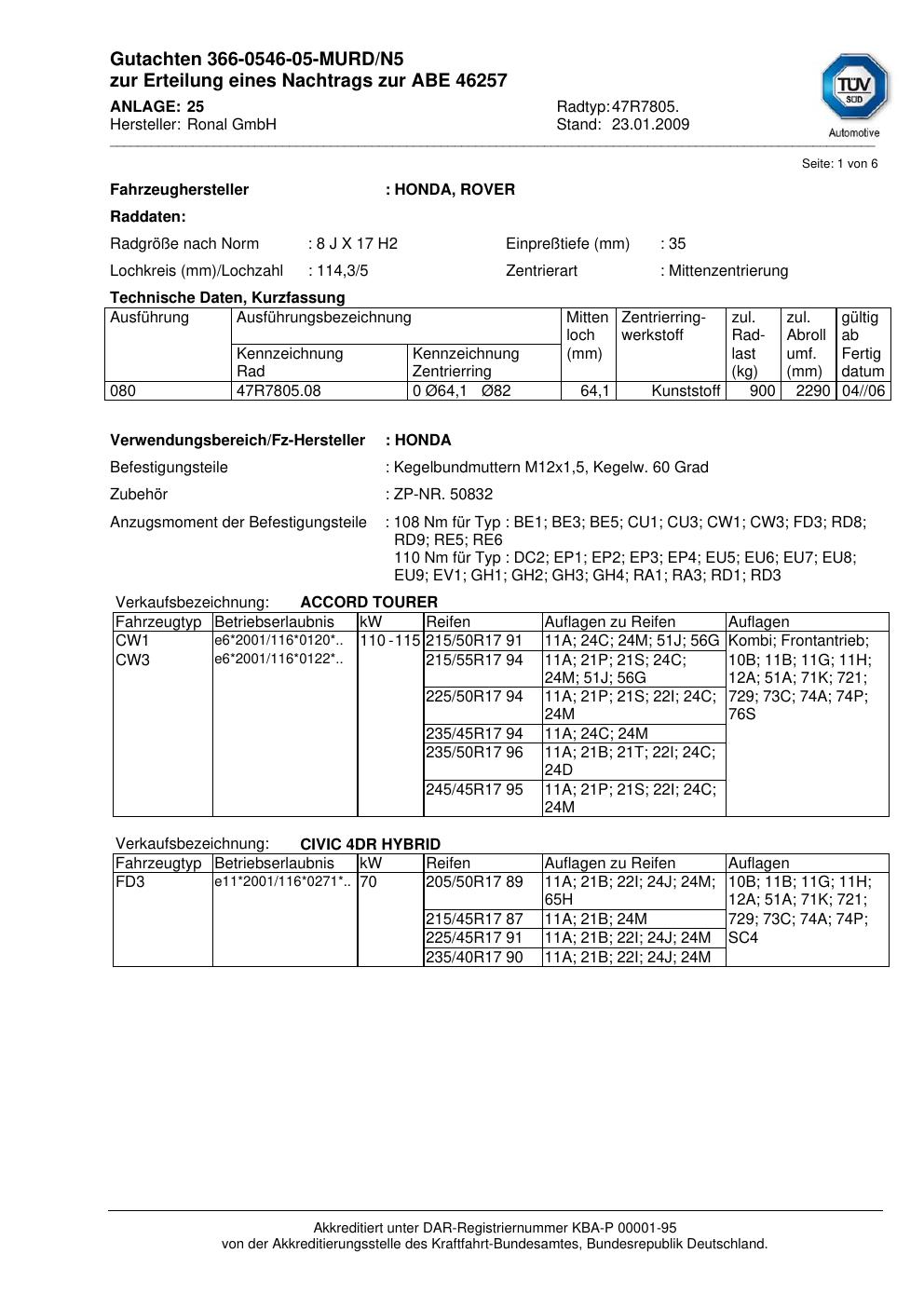 Dieses Gutachten (abe) bezieht sich auf die Alufelge Ronal 47R7805 in der Ausführung 8Jx17 ET 0, Mittenloch 0 mm (KBA 46257). Im PDF findest du typischerweise zulässige Reifengrößen, Auflagen/Anbauhinweise und – je nach Dokument – Hinweise zur Eintragung.